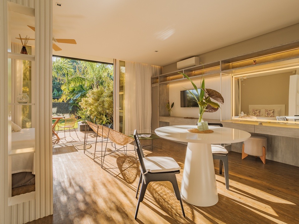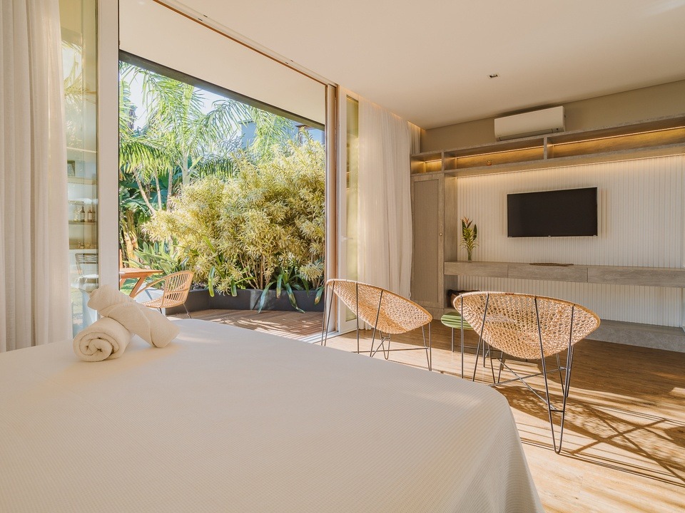 Relaxe em uma suíte que combina elegância e exclusividade, onde o luxo encontra a natureza. Com um jardim privativo encantador e acesso direto ao nosso jardim central, este refúgio oferece um oásis de tranquilidade e beleza.